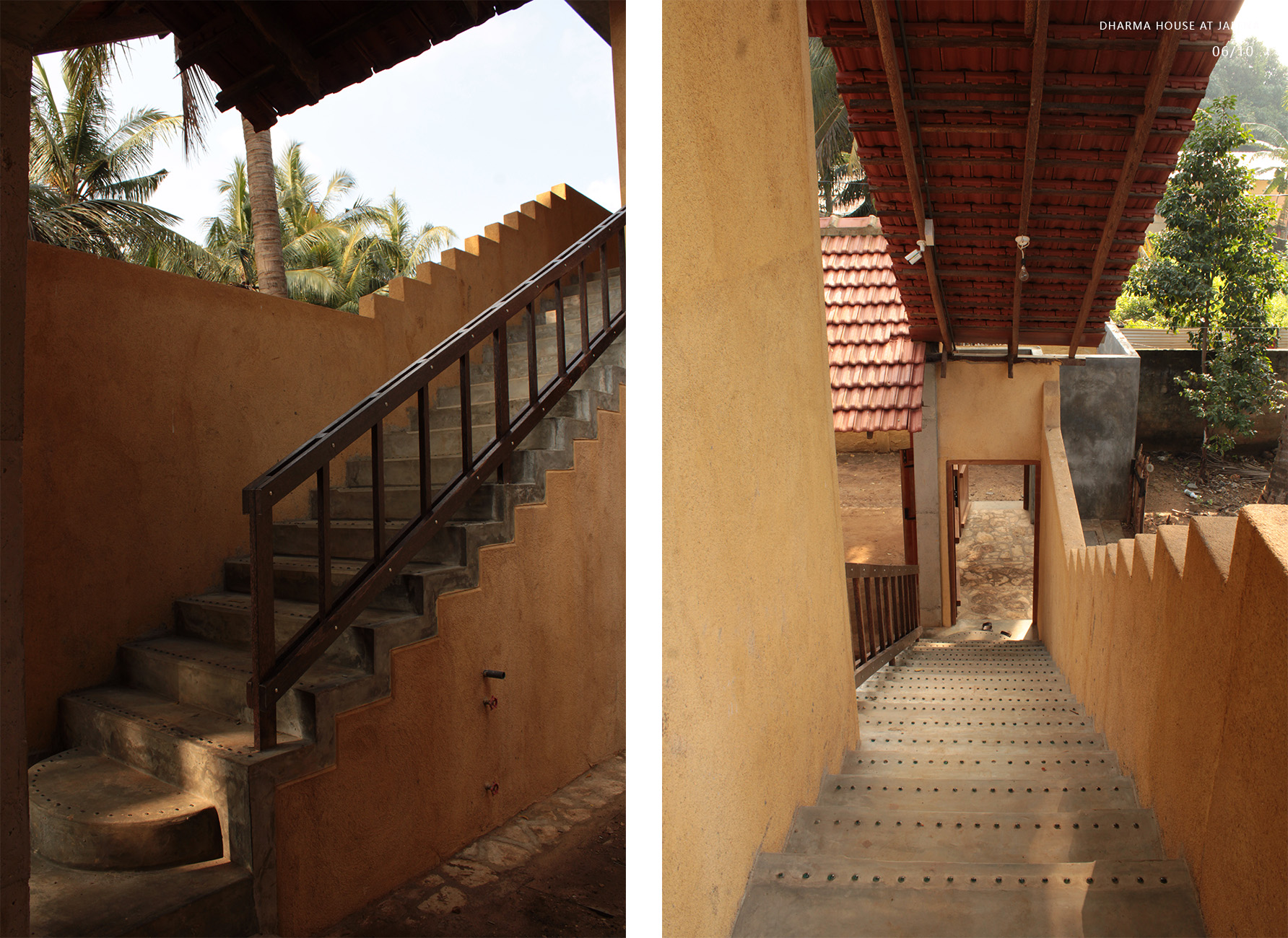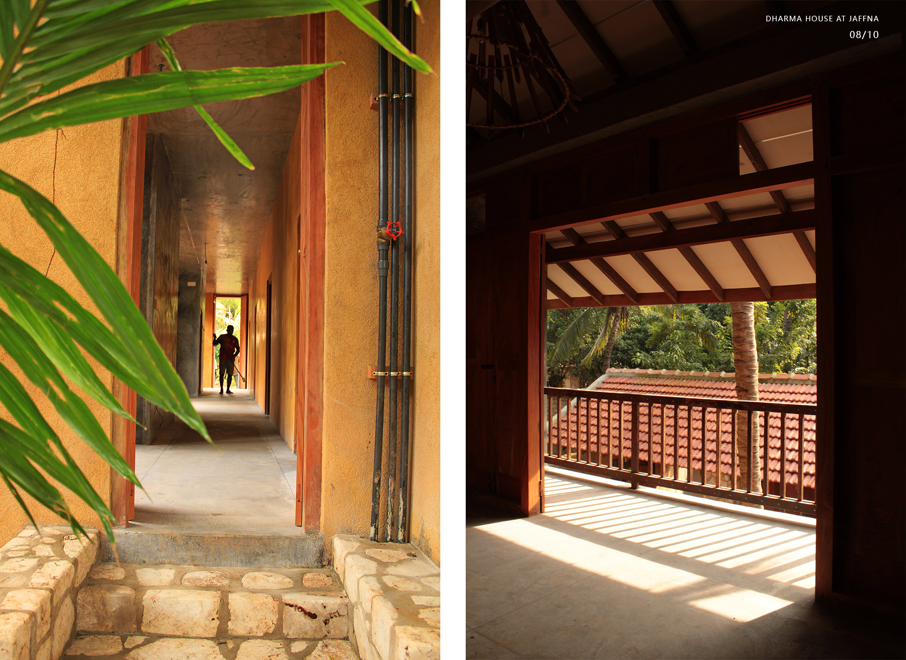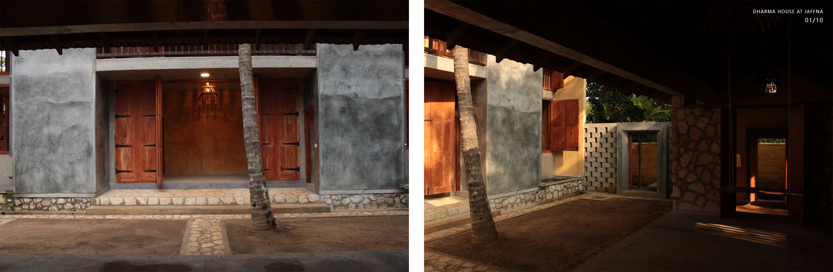 Private Residencies - Merit AwardClient desired a native house after 30 years’ stay in abroad, which could heal bitter memory of the destroyed house in civil war. The land transferred by generations, Out of 1608m2, 393m2 decided for dwelling, rest for coconut plantation. The location is dense in a kilometre distance to the heart of Jaffna. The native community displaced to different parts of the world, new community is emerging. Two blocks are in different scale interconnected by the staircase with flying roof expressing a family. The transition courtyard grasps nutritious sun light in the morning while admitting natural light, air movements and transforming the internal spaces. Two blocks consist multifunctional and private. The scale and details of multifunction hall validates social justice with the immediate neighbouring community, whose income depends on daily wages and optimizes private life for all dwellers without discrimination. The multifunctional hall facilitates social interactions space for family, neighbours and domestic service providers via all creatures. This revives the life lived in a simple, slower phase and sharing socio economic and political dialogs. The space engraves happy and sad moments throughout life transformation, the courtyard extends the moments when needed. The private block consists of bedrooms, kitchen, sitting, dining and toilets. Openings are detailed to justify the law of sight for individual limit and unlimit, while admitting light and ventilation. Most spaces are arranged to focus the courtyard magnetise interactions. The functional spaces are arranged to start and end the day with the sunrise and sun set.