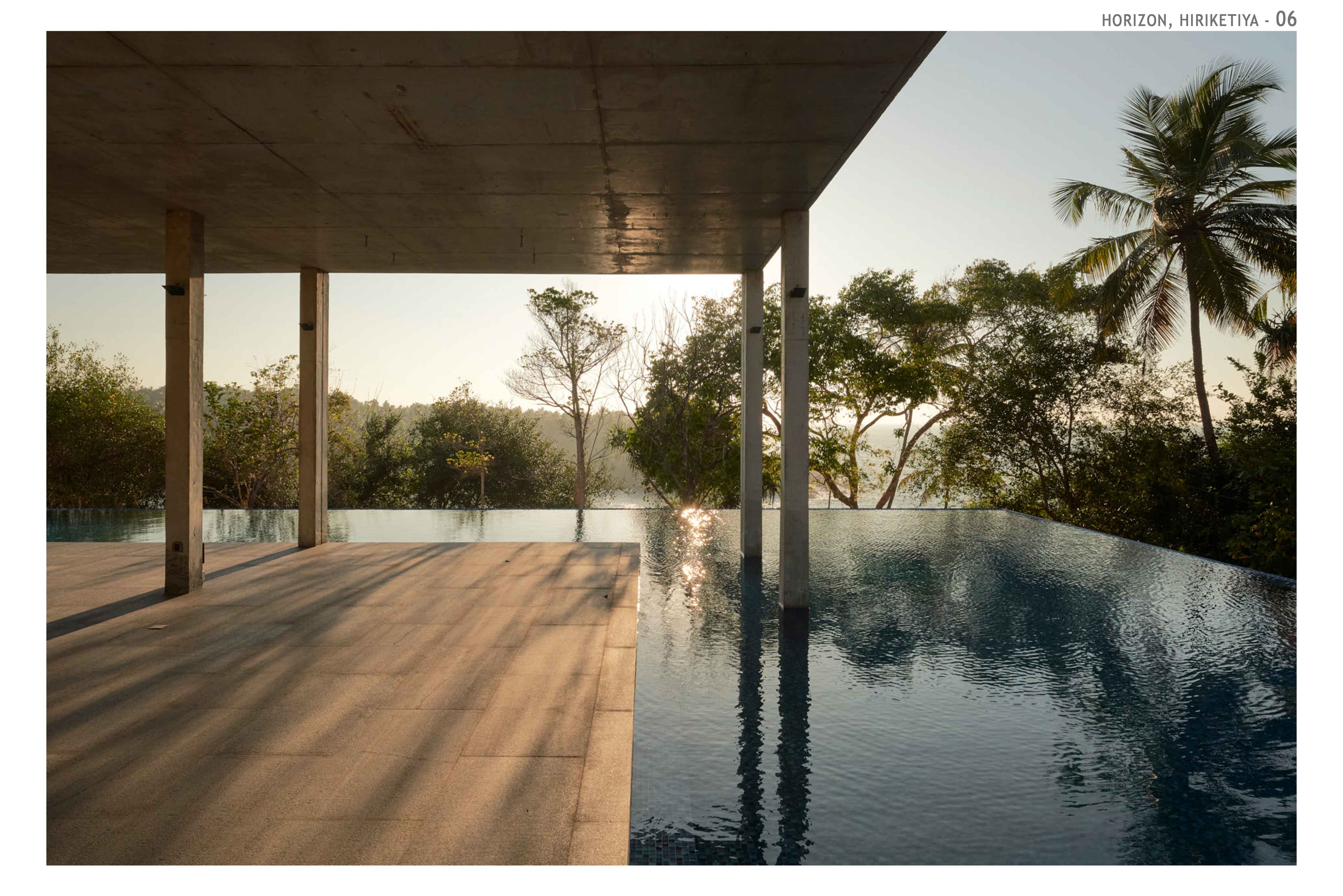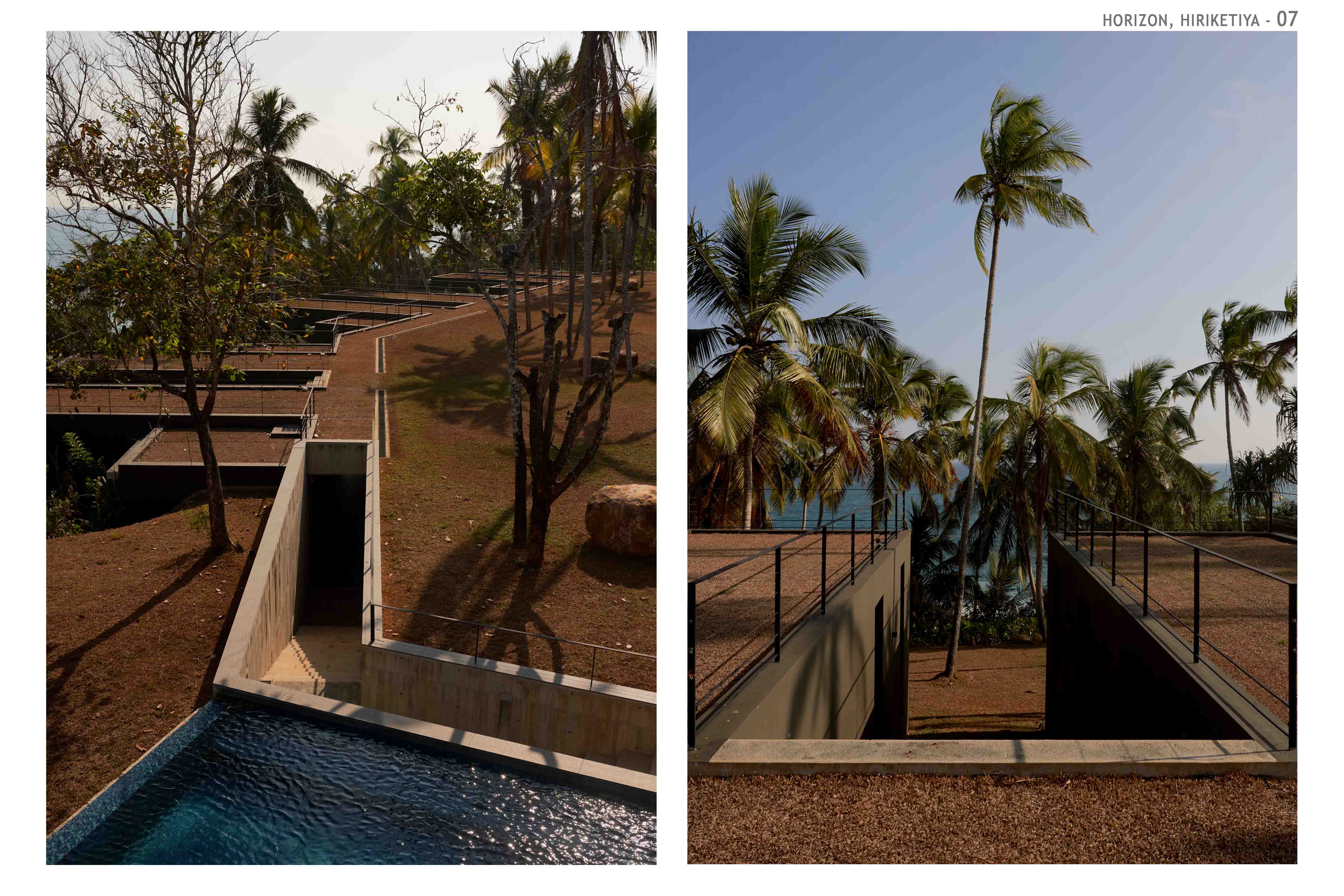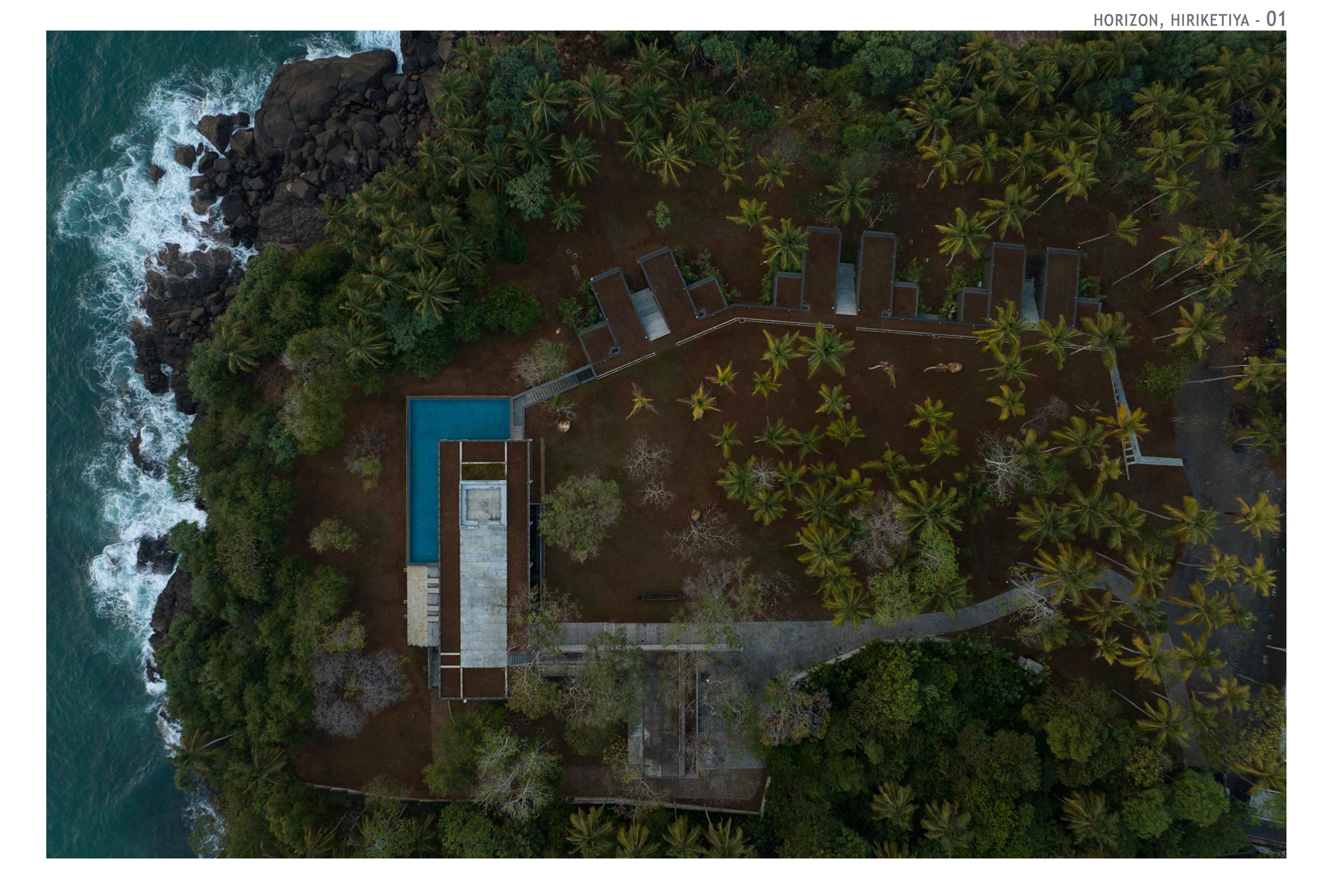 Hospitality Architecture - Excellence AwardThe Horizon is an exclusive family retreat located on the cliffs overlooking the picturesque Hiriketiya Bay in Sri Lanka, renowned for its stunning surf spots and emerald-blue waters. Designed for a prominent Sri Lankan business family, the house functions as a getaway for three generations, accommodating large family gatherings, vacations, and celebrations. At the heart of the home is the main pavilion, which houses the living, dining, and pantry areas. These spaces open to an infinity pool that seemingly hovers above the bay, offering dramatic views of sunrises, sunsets, and local wildlife. The pavilion’s green roof, complete with sunk seating, provides a tranquil spot to appreciate both the lush greenery and the expansive bay. A narrow, sunken corridor leads to the private bedroom wings, each with its own unique view of the bay. These wings are separated by courtyards, ensuring privacy and seclusion. Narrow steps from the bedrooms descend to the rocks and water below, offering direct access to the bay.The Horizon’s innovative design incorporates locally sourced materials and eco-friendly elements, blending modern living with sustainability. The home’s underground living spaces maximize privacy while maintaining unobstructed views. The result is a serene and luxurious retreat that harmonizes with its coastal environment, providing the perfect sanctuary for the family while respecting the natural beauty of Hiriketiya Bay.