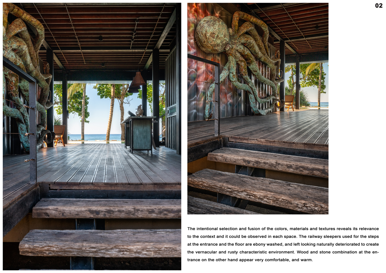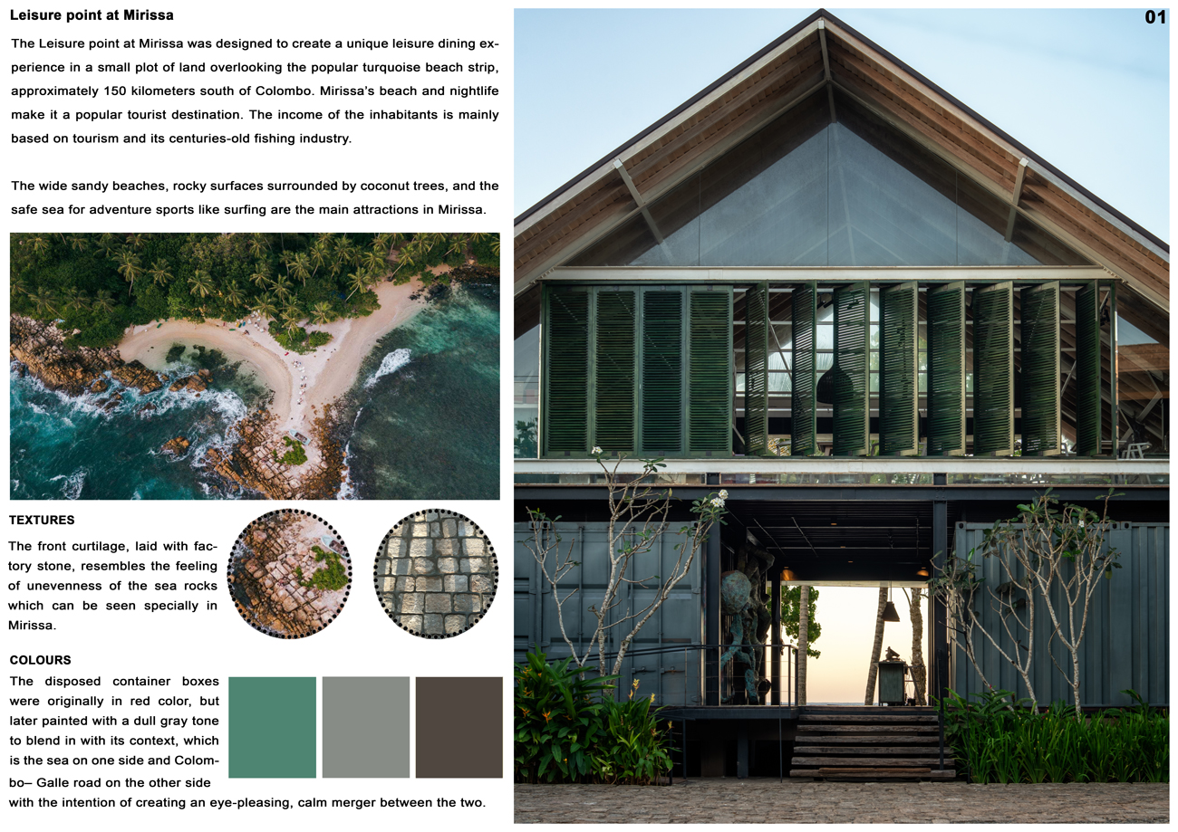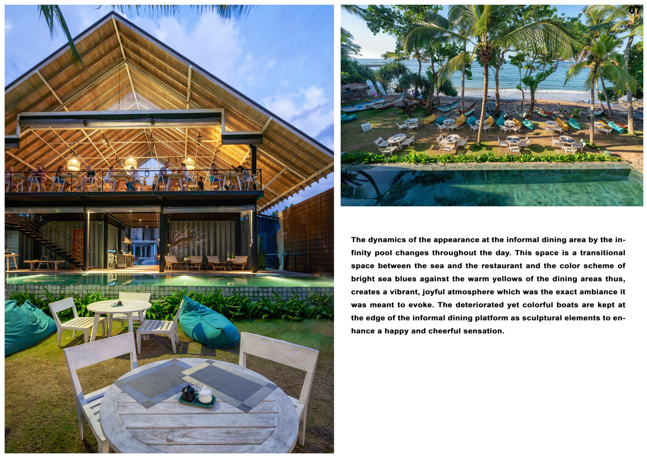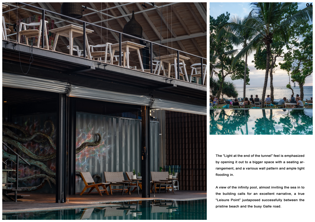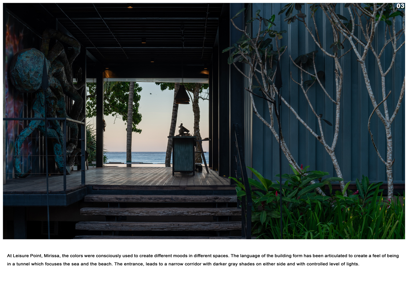 Excellence AwardThe Leisure point at Mirissa was designed to create a unique leisure dining experience in a small plot of land overlooking the popular turquoise beach strip, approximately 150 kilometers south of Colombo. Mirissa’s beach and nightlife make it a popular tourist destination. The income of the inhabitants is mainly based on tourism and its centuries-old fishing industry. The wide sandy beaches, rocky surfaces surrounded by coconut trees, and the safe sea for adventure sports like surfing are the main attractions in Mirissa. This 10 perch land is situated in a blissful tourist activity destination, between the sea beach and the Galle road. The restaurant has been designed to efficiently utilize the small building footprint which houses a welcoming guest lobby, 52 pax restaurant, 40 pax informal dining, pool, service and other facilities.