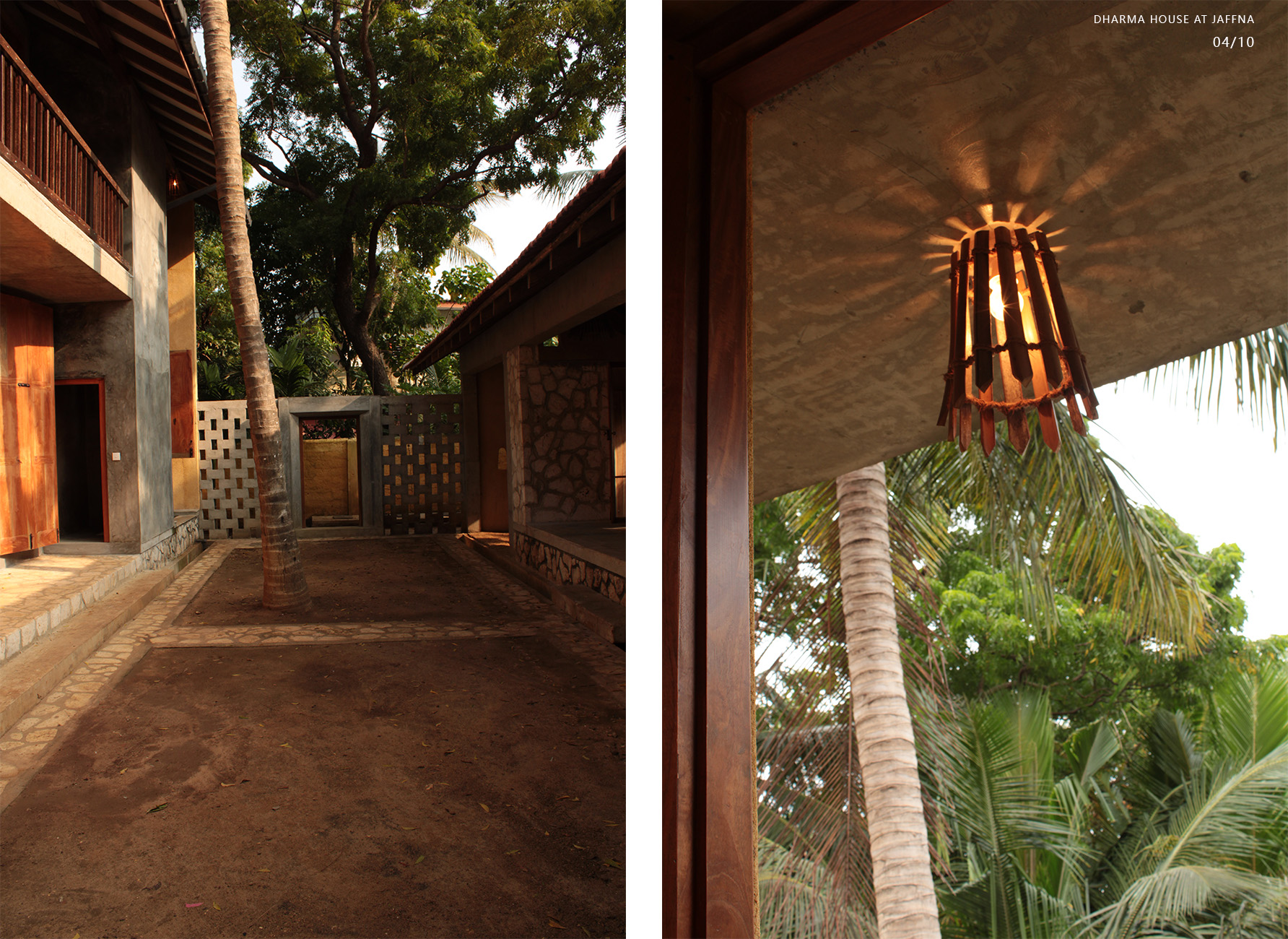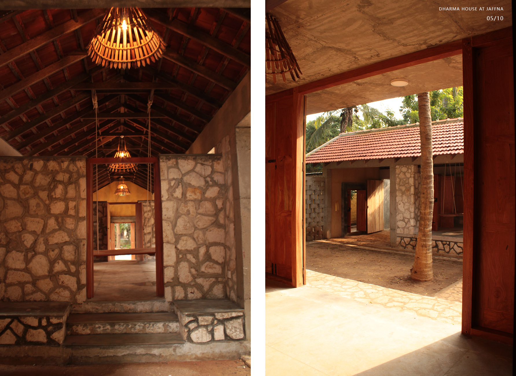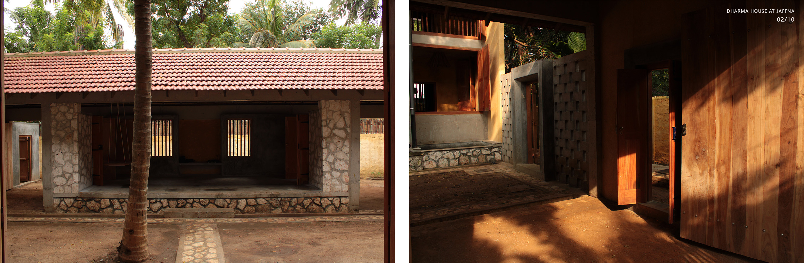 Private Residencies - Merit AwardClient desired a native house after 30 years’ stay in abroad, which could heal bitter memory of the destroyed house in civil war. The land transferred by generations, Out of 1608m2, 393m2 decided for dwelling, rest for coconut plantation. The location is dense in a kilometre distance to the heart of Jaffna. The native community displaced to different parts of the world, new community is emerging. Two blocks are in different scale interconnected by the staircase with flying roof expressing a family. The transition courtyard grasps nutritious sun light in the morning while admitting natural light, air movements and transforming the internal spaces. Two blocks consist multifunctional and private. The scale and details of multifunction hall validates social justice with the immediate neighbouring community, whose income depends on daily wages and optimizes private life for all dwellers without discrimination. The multifunctional hall facilitates social interactions space for family, neighbours and domestic service providers via all creatures. This revives the life lived in a simple, slower phase and sharing socio economic and political dialogs. The space engraves happy and sad moments throughout life transformation, the courtyard extends the moments when needed. The private block consists of bedrooms, kitchen, sitting, dining and toilets. Openings are detailed to justify the law of sight for individual limit and unlimit, while admitting light and ventilation. Most spaces are arranged to focus the courtyard magnetise interactions. The functional spaces are arranged to start and end the day with the sunrise and sun set.