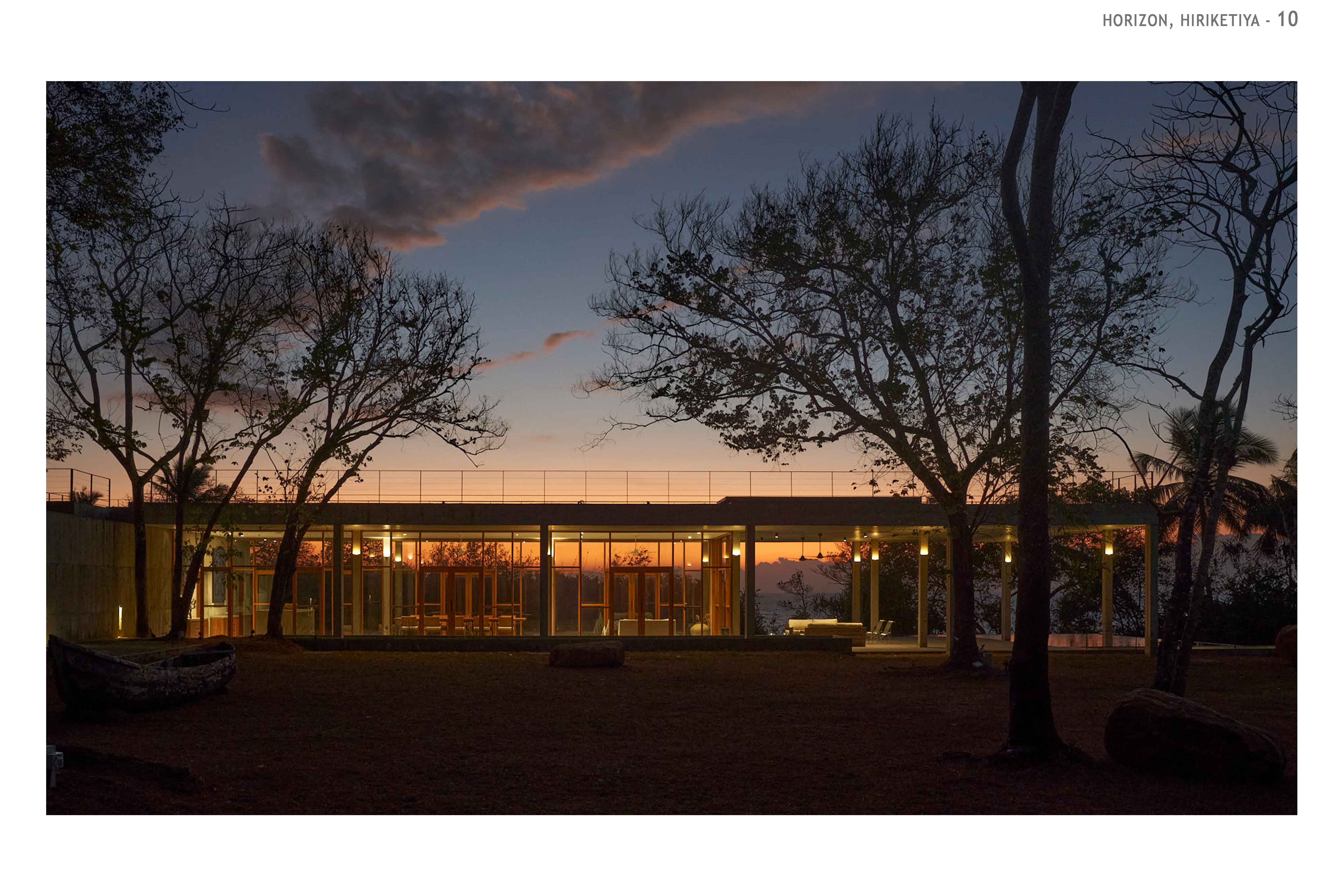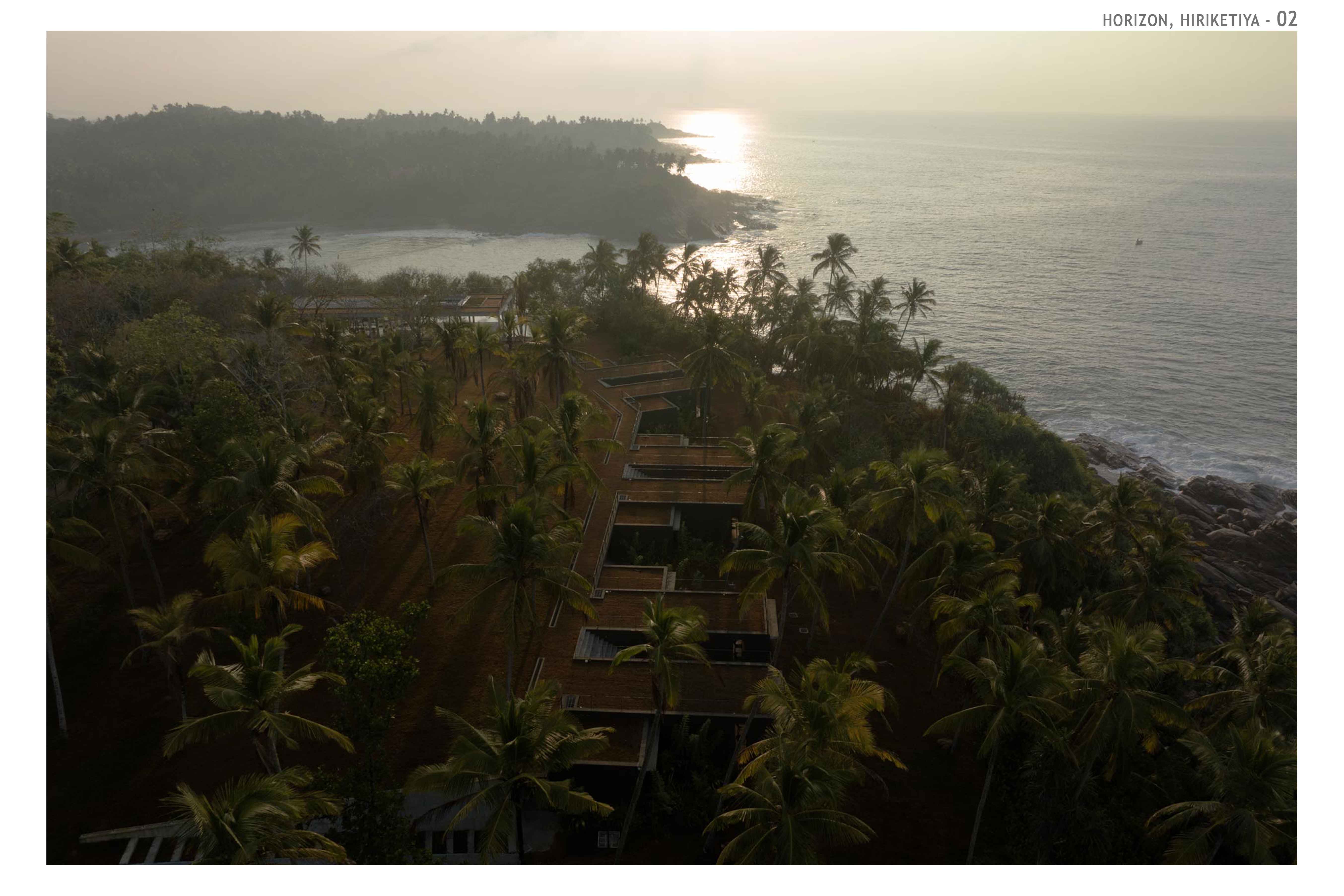 Hospitality Architecture - Excellence AwardThe Horizon is an exclusive family retreat located on the cliffs overlooking the picturesque Hiriketiya Bay in Sri Lanka, renowned for its stunning surf spots and emerald-blue waters. Designed for a prominent Sri Lankan business family, the house functions as a getaway for three generations, accommodating large family gatherings, vacations, and celebrations. At the heart of the home is the main pavilion, which houses the living, dining, and pantry areas. These spaces open to an infinity pool that seemingly hovers above the bay, offering dramatic views of sunrises, sunsets, and local wildlife. The pavilion’s green roof, complete with sunk seating, provides a tranquil spot to appreciate both the lush greenery and the expansive bay. A narrow, sunken corridor leads to the private bedroom wings, each with its own unique view of the bay. These wings are separated by courtyards, ensuring privacy and seclusion. Narrow steps from the bedrooms descend to the rocks and water below, offering direct access to the bay.The Horizon’s innovative design incorporates locally sourced materials and eco-friendly elements, blending modern living with sustainability. The home’s underground living spaces maximize privacy while maintaining unobstructed views. The result is a serene and luxurious retreat that harmonizes with its coastal environment, providing the perfect sanctuary for the family while respecting the natural beauty of Hiriketiya Bay.