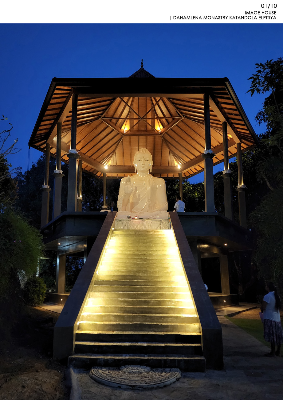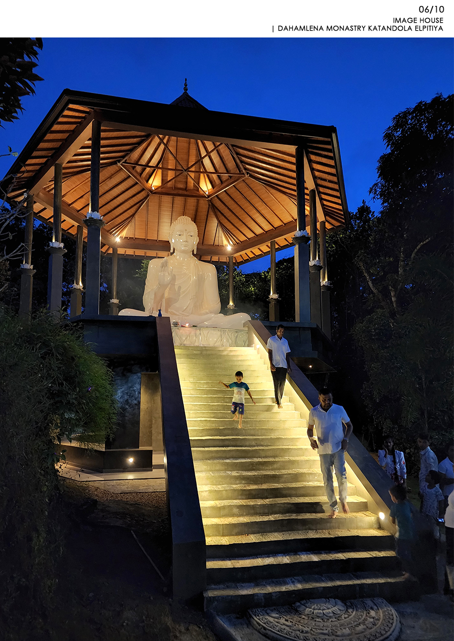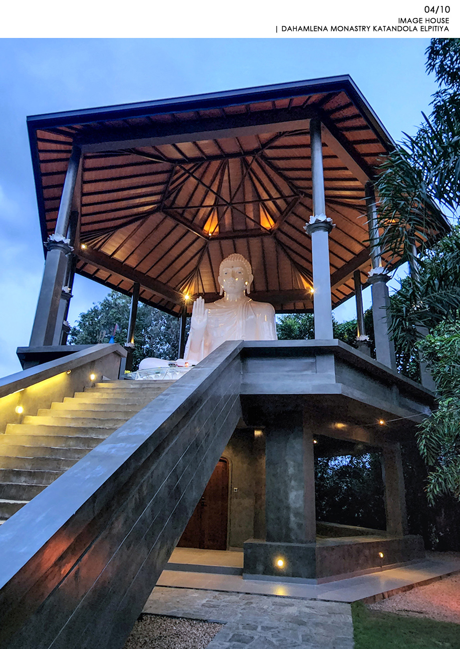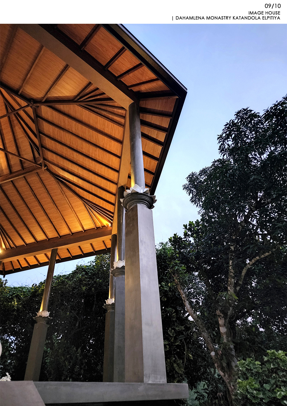 Religious and Cultural - Shortlisted NomineeKatandola village located in Elpitiya is lived by an estate community whose livelihood is flourished on the crops of tea, rubber and coconut. Aranya is the highlight of the village and, for years there was a need for an image house. The temple was built with the immense contributions of the villages for materials and labour and they held the pride of building and owning it and the raised platform refers to their respect towards the Buddhist Philosophy. This has created the community more united over good cause of action and the honest interest of the village and becoming better citizens. The entrance to the main temple is in alignment in the same axis with the entrance to the image house. The architect also wanted to raise the platform where the Buddha statue sits for keeping it the heist hierarchical point to worship. The form of hexagon platform and roof was selected to create the balance from all sided externally and internally. Because of the hexagon plan form, the platform and the walking path around the Buddha statue could accommodated with ease allowing enough space for circulation. The roof on the top highlight the statue charmingly by having a geometrically balance with traditional details of rafters and placing the statue pinnacle aligning the highest peak of the roof. The Buddha statue is casted with a personally know artist to the architect carefully to bring the best expressions of stature to make the pilgrims to get inspired with its “arshirwada mudra”.