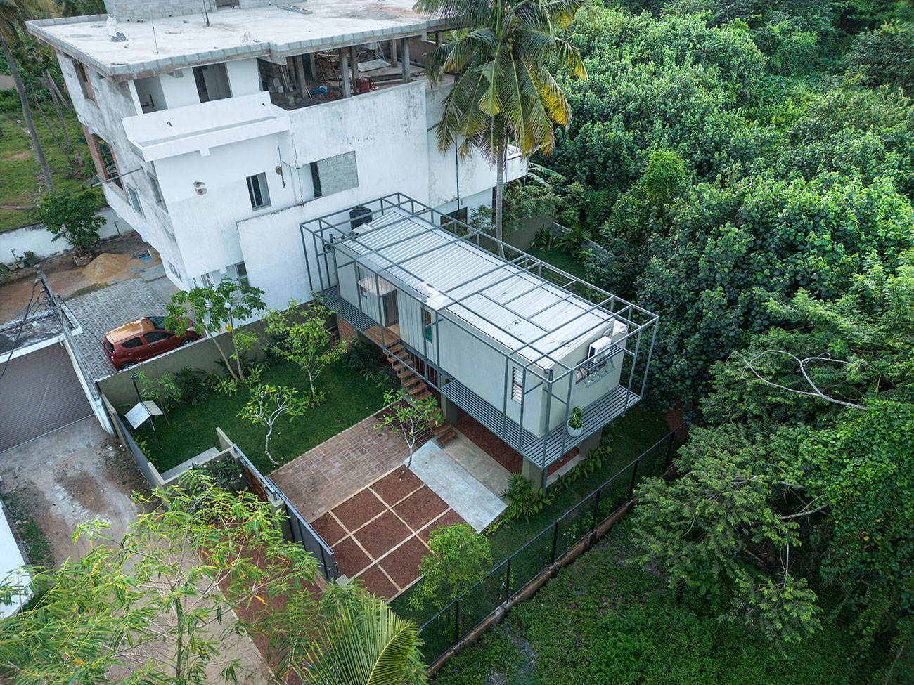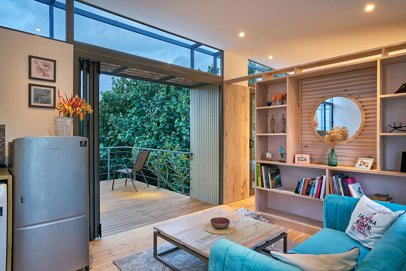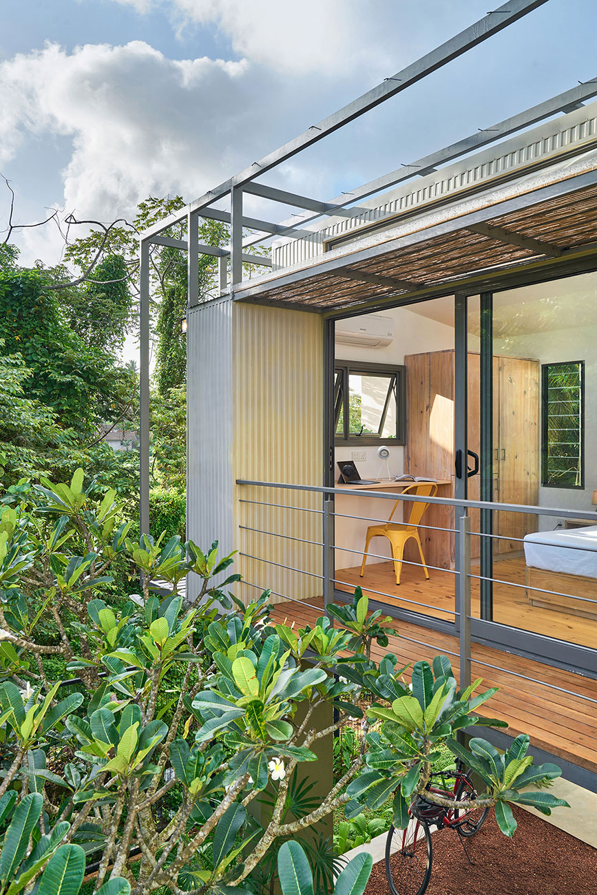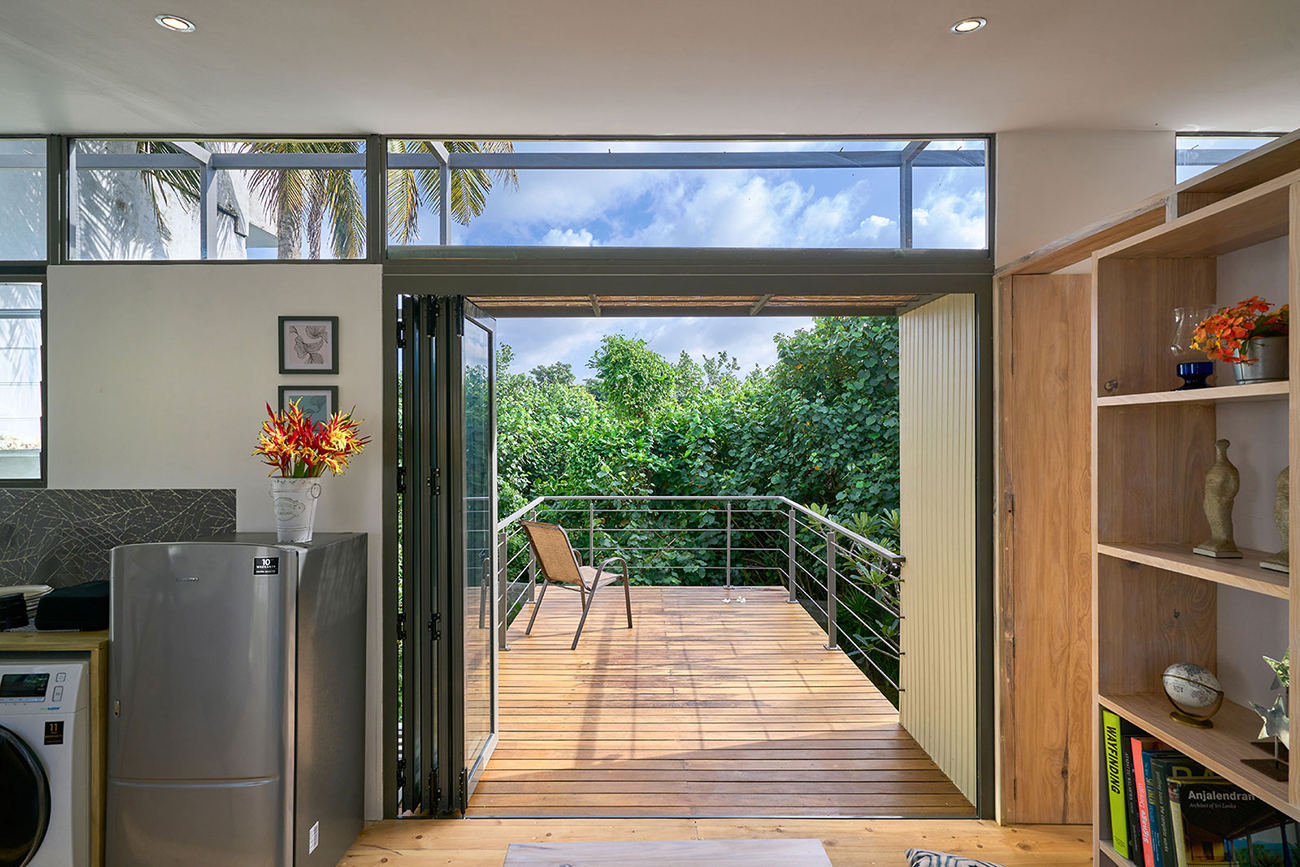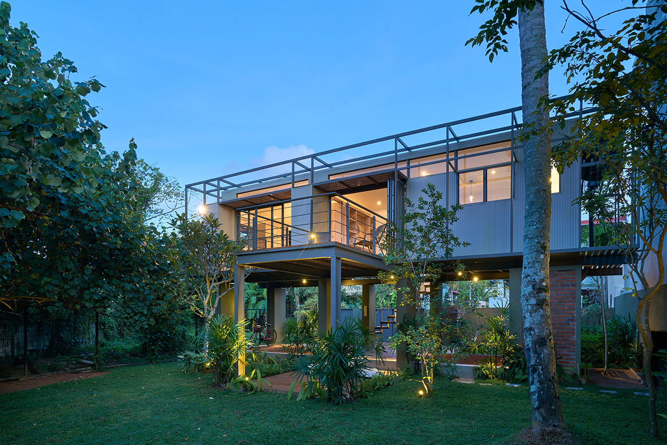 Private Residencies - Shortlisted NomineeThe site, located in the suburbs of Colombo, faces a marshy land, providing a unique backdrop for a residence tailored to a software engineer client who now works from home post-pandemic. With a focus on creating a peaceful live-work environment, the project embraces the "living big in a small house" ethos, prioritizing intentional simplicity and essential needs to minimize costs while fostering a homely ambiance. Sustainable architecture principles are integral to the project's design. The structure seamlessly blends a concrete substructure with a predominantly steel superstructure using innovative elements like a grid pattern of box bars and corrugated Zn-Al sheets for cost-effective strength and aesthetics. Exterior and interior coverings, utilizing roofing sheets and cement plaster boards, incorporate thermal insulation to mitigate heat gain. Cross ventilation, a narrow building breadth, and strategic orientation further enhance energy efficiency and interior cooling. The project's sustainability extends to efficient space utilization, a reduced environmental footprint, and a harmonious integration with nature through a larger garden. Socially responsible architecture is evident in its affordability, adaptability, and flexibility, making housing accessible across socio-economic backgrounds. By offering a holistic vision for sustainable living, this project serves as an enlightening solution to the current housing challenges in Sri Lanka, presenting a harmonious synthesis of intentional simplicity, cost-effectiveness, and environmental responsibility.