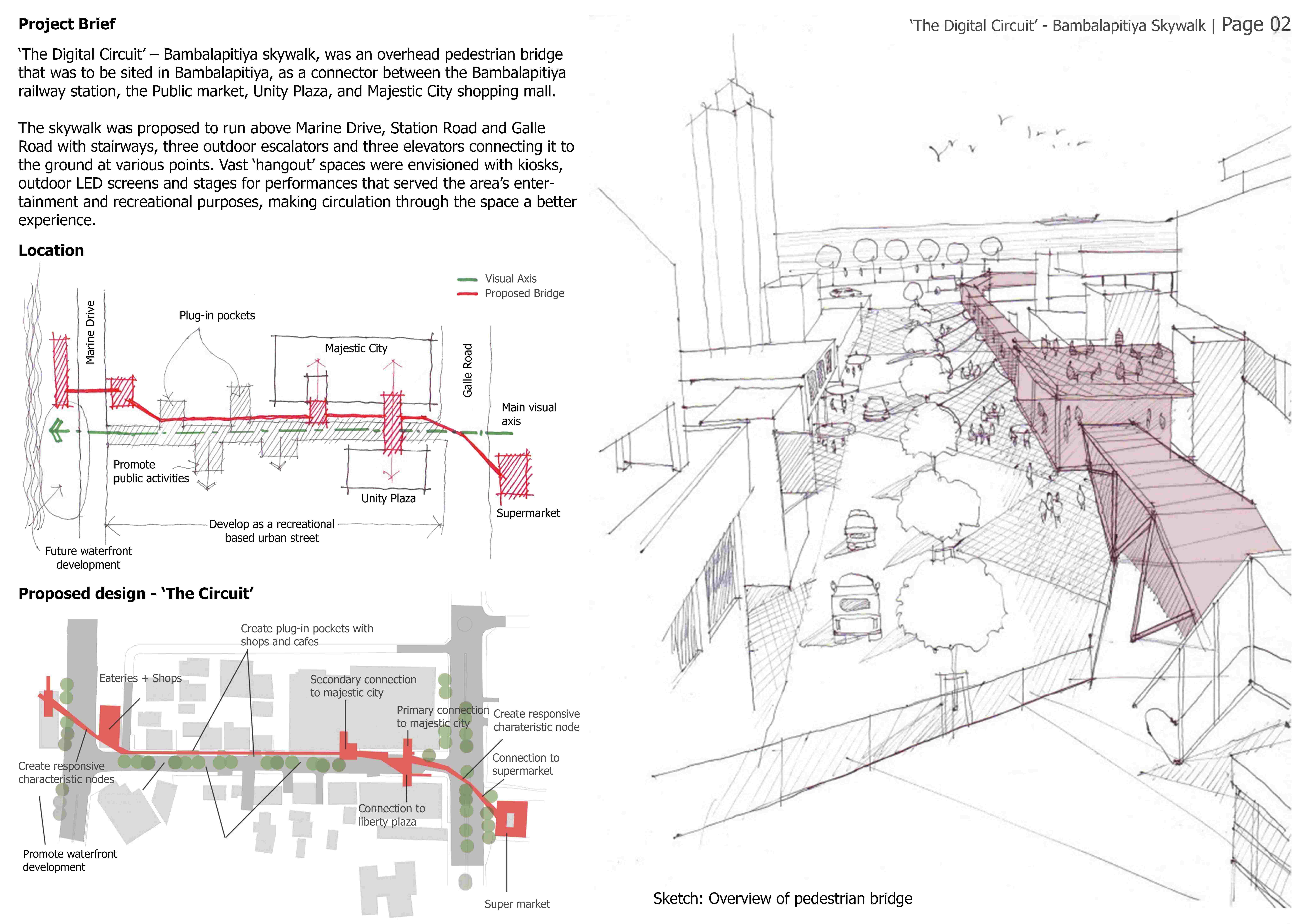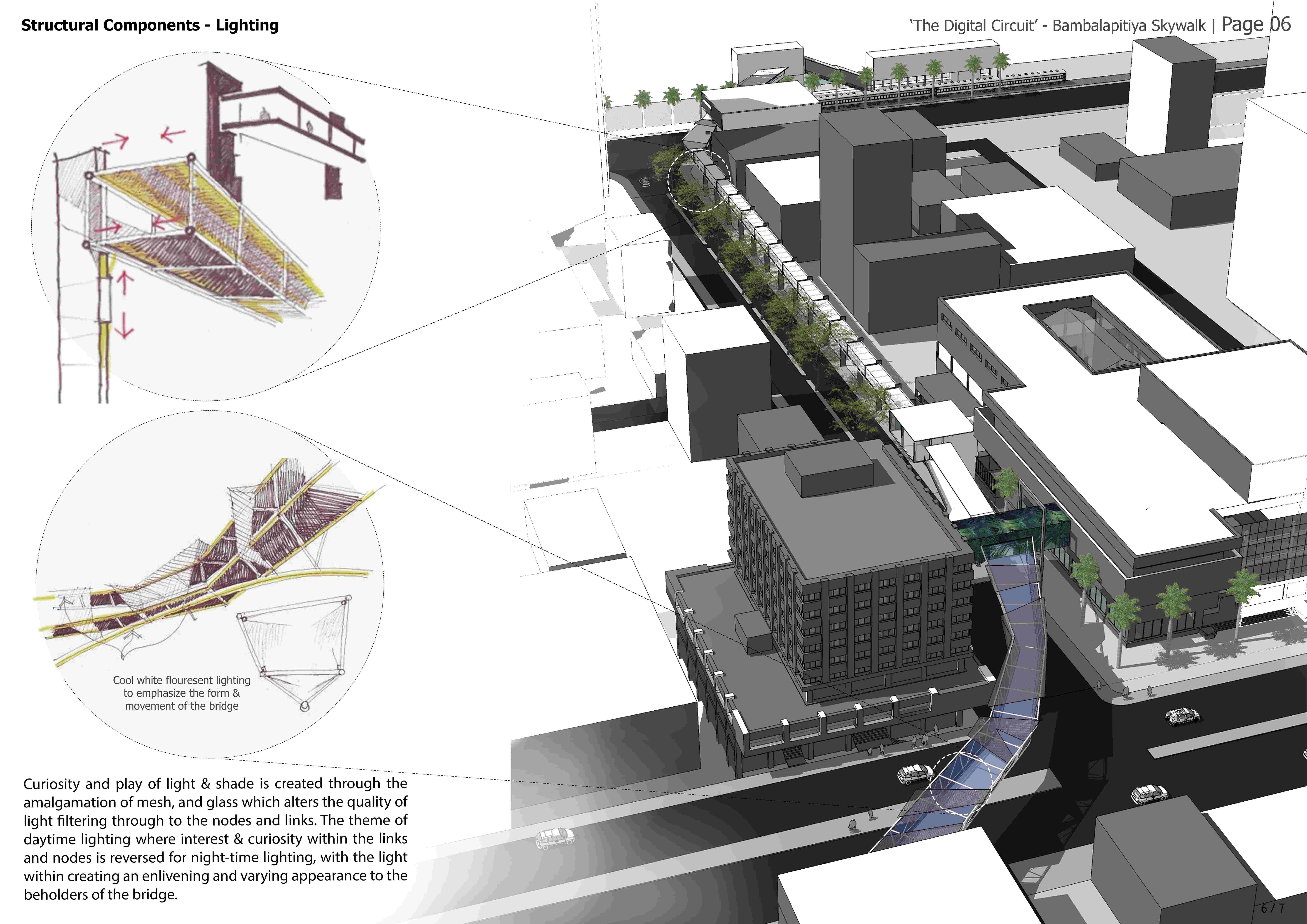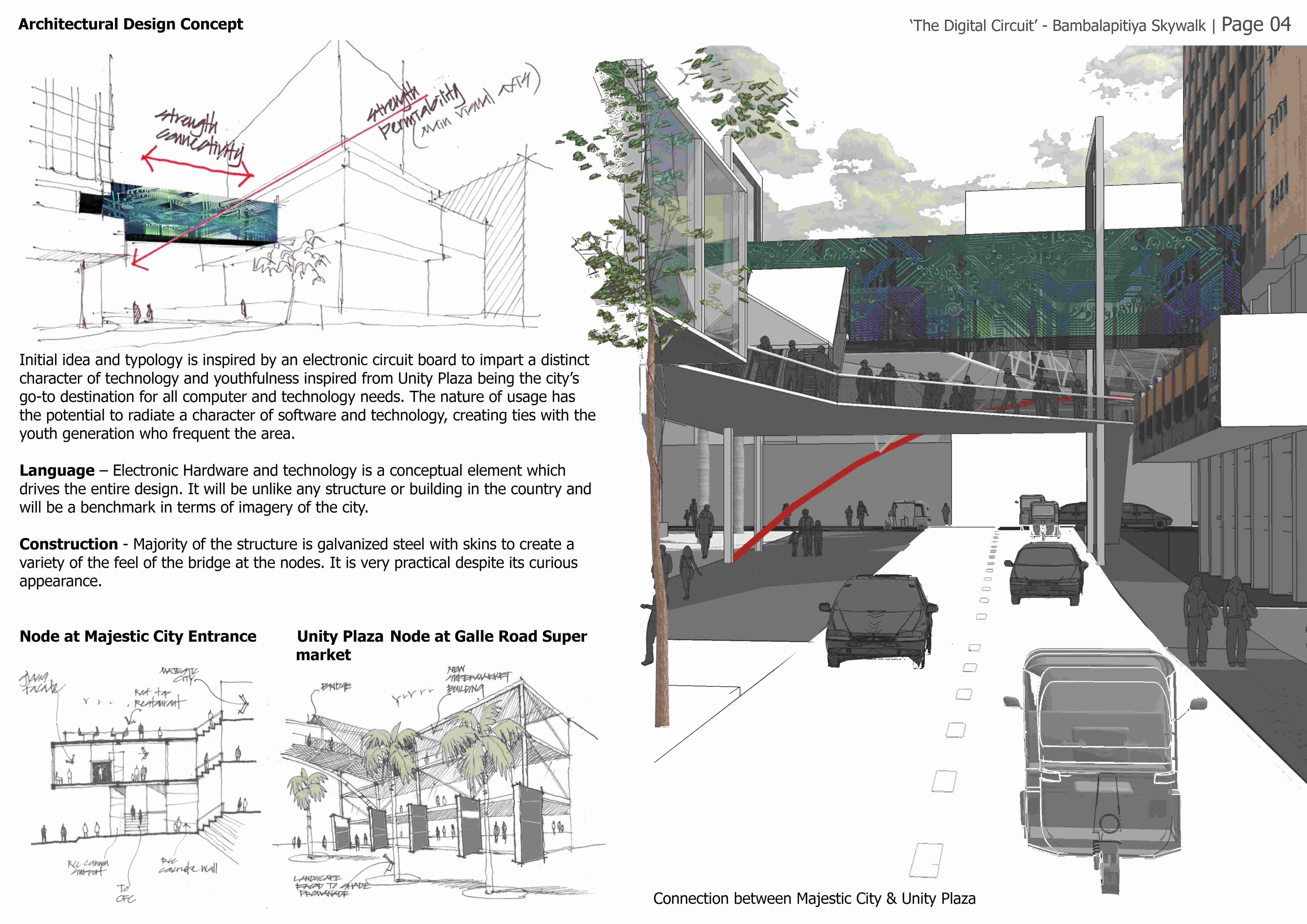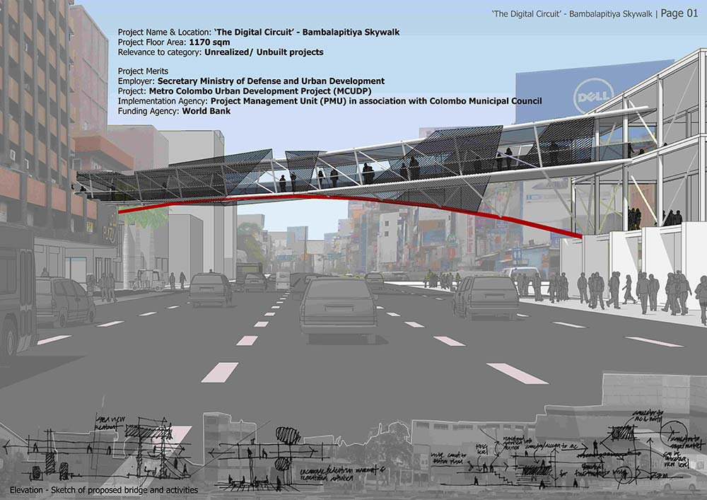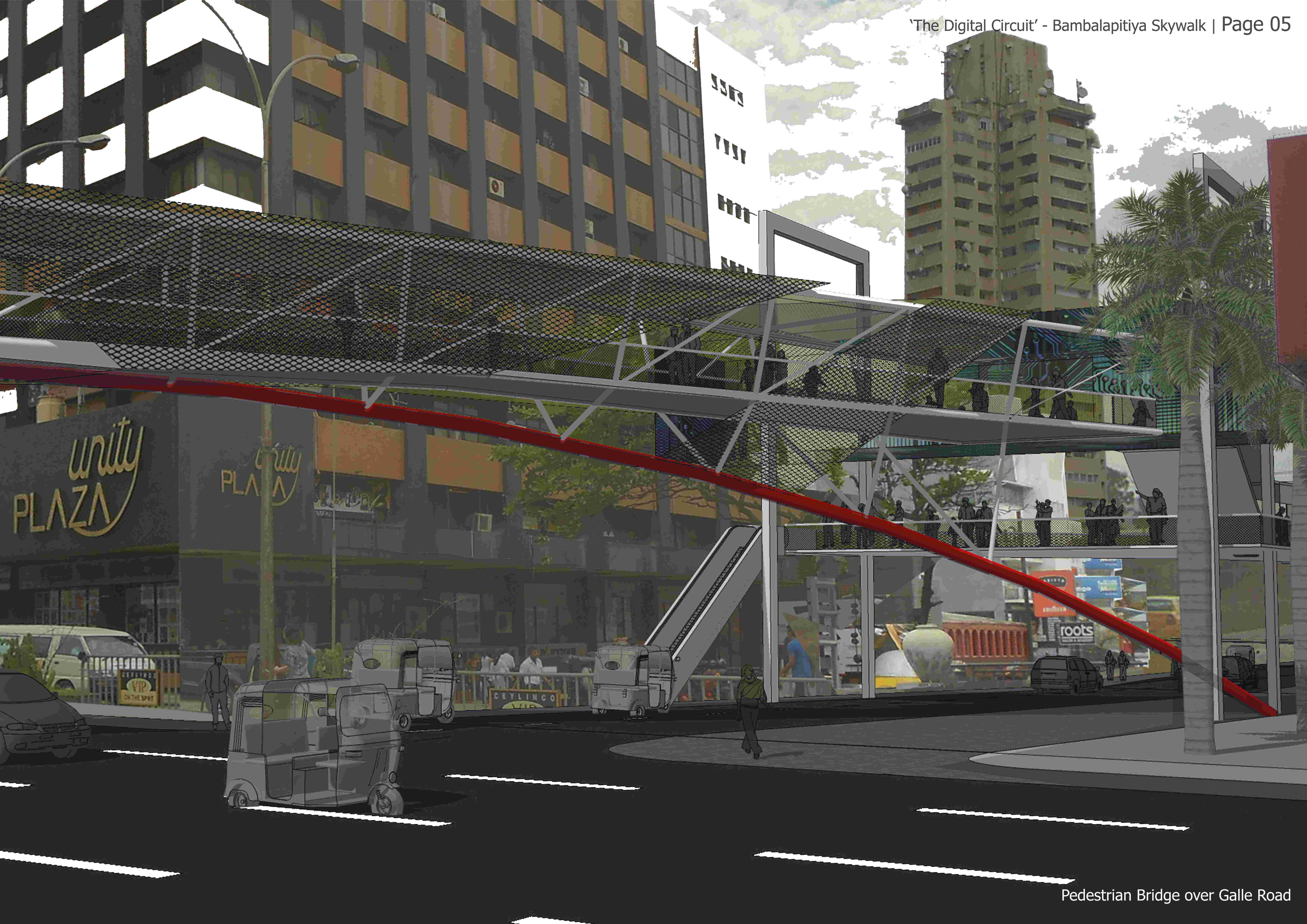 Honorable Mention‘The Digital Circuit’ – Bambalapitiya skywalk, was an overhead pedestrian bridge, that was to be sited in Bambalapitiya, as a connector between the Bambalapitiya railway station, the public market, Unity Plaza, and Majestic City shopping mall. The skywalk was proposed to run above Marine Drive, Station Road and Galle Road with stairways, three outdoor escalators and three elevators connecting it to the ground at various points. Vast ‘hangout’ spaces were envisioned with kiosks, outdoor LED screens and stages for performances that served the area’s entertainment and recreational purposes, making circulation through the space a better experience. Unity Plaza, the city’s main source of tech products, initiated the concept of the ‘the digital circuit’ with the intention of one’s experience of treading through a digital circuit board. The LED lights create a magical experience of one’s presence within a computer most prominently during the day’s darker hours. The primary elements of the bridge included a galvanized steel structure with perforated mesh and fiber sheet coverings, and an engraved glass box with the print of a digital circuit board. A secondary link was put forward tethering the Unity Plaza and the Majestic City Shopping Complex, for which the owners of the shopping complexes consented to fund. Furthermore, the Secretary of the Defense and Urban Development Authority requested the Bambalapitiya railway station and the CMC Public Market to be revamped, accommodating all modern facilities. The two ends of the bridge were positioned to lead into the Bambalapitiya railway station and the market complex on either end. The Cargills group also agreed to fund the reconstruction of the railway station with an agreement of the presence of a roof slab for their business activities. Thus, this project engaged all possible stakeholders, using incentives to private companies in order to uplift the project and reduce the financial burden on the state.